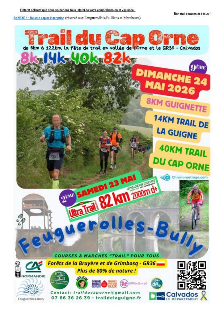 Samedi 23 et Dimanche 24 mai 2026: 9e édition de l'endurance en vallée de l'Orne "Trail du Cap Orne" (Dimanche: 8km "Trail Guignette" ou 14km "Trail de la Guigne" (140mD+) ou 40km "Trail du Cap Orne" (585md+) - Samedi: 2eme édition de l'Ultra Trail du Cap Orne 82km GR36 (2000md+) . (Challenge possible sur 2 jours: PETIT DÉFI 96km-2140mD+ ou GRAND DÉFI 122km-2560mD+) >>>>>>>>>>>>>>>>>>>>>Dimanche 27 décembre 2026: 4ème édition du "Trail de la Guigne" (14km et 28km).